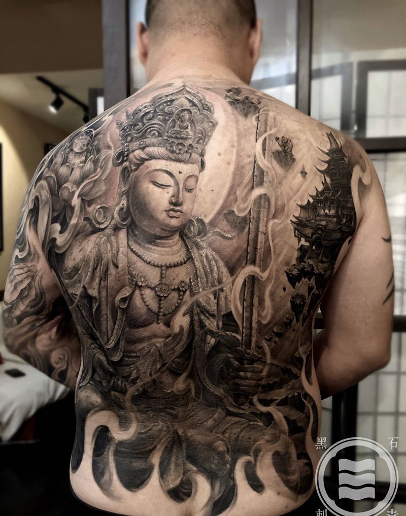 当前位置: 首页 >天津市纹身店-黑石刺青(天津店)纹身图案>虚空藏菩萨纹身图片_背部新传统欧美写实虚空藏菩萨石雕纹身图案