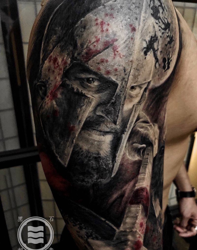 斯巴达纹身图片_手臂欧美写实斯巴达狮子纹身图案