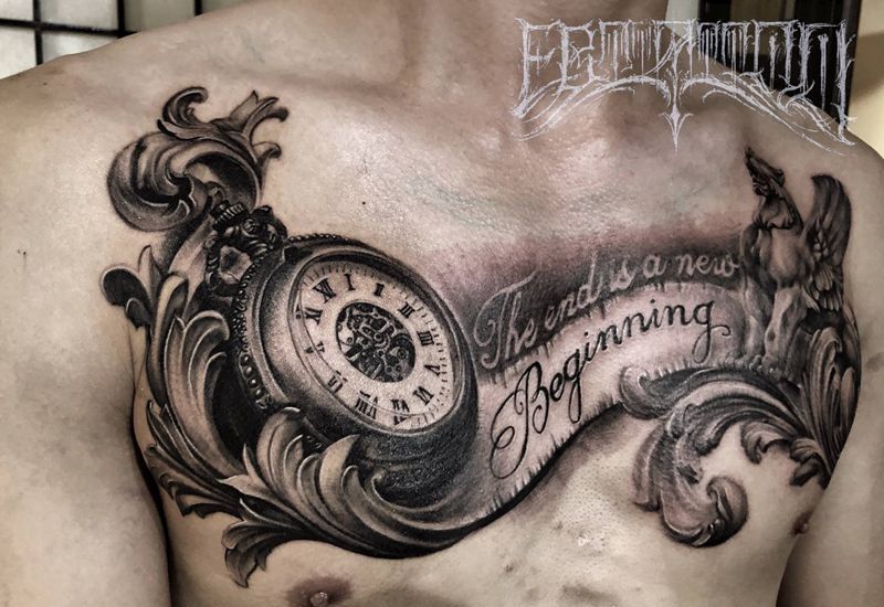 当前位置: 首页 >天津市纹身店-黑石刺青(天津店)纹身图案>守护时光纹身图片_胸部欧美写实花体字钟表飞狮英文纹身图案