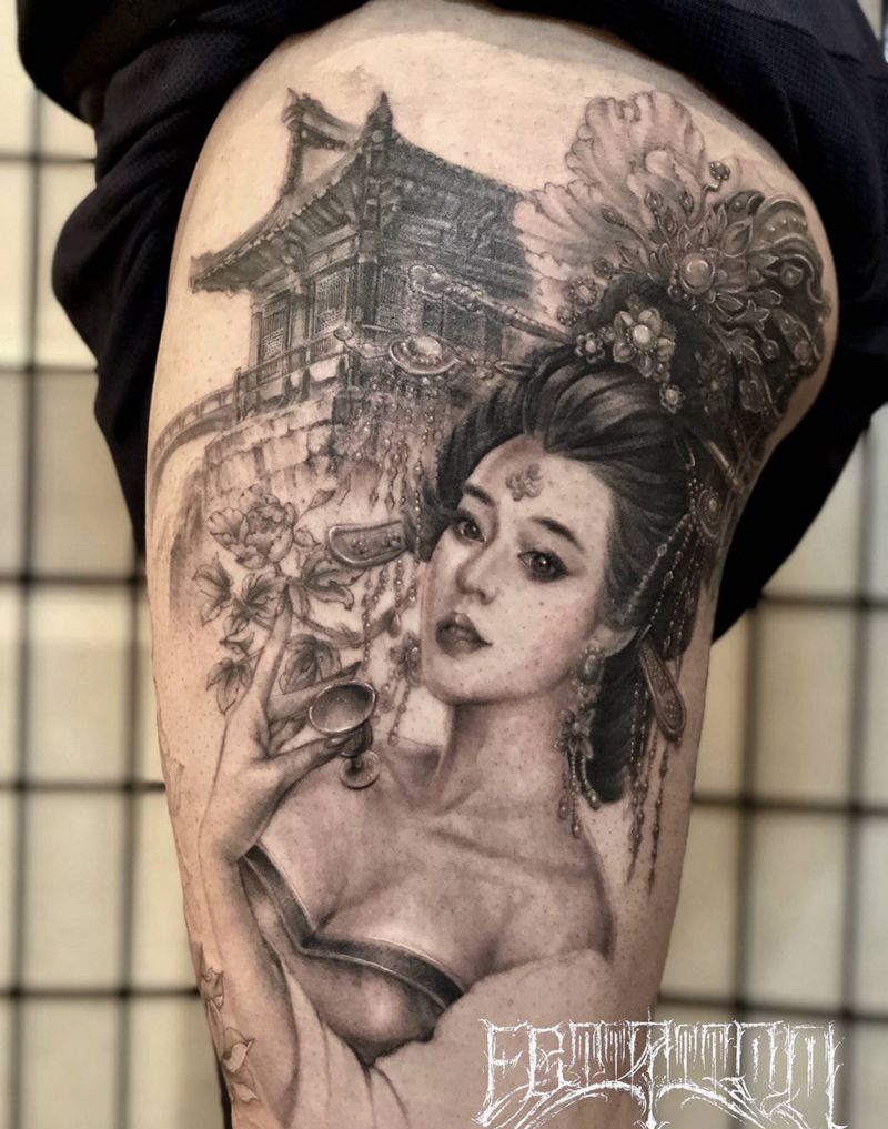 当前位置: 首页 >天津市纹身店-黑石刺青(天津店)纹身图案>四美图纹身图片_腿部臀部新传统欧美写实美女牡丹杨贵妃纹身图案