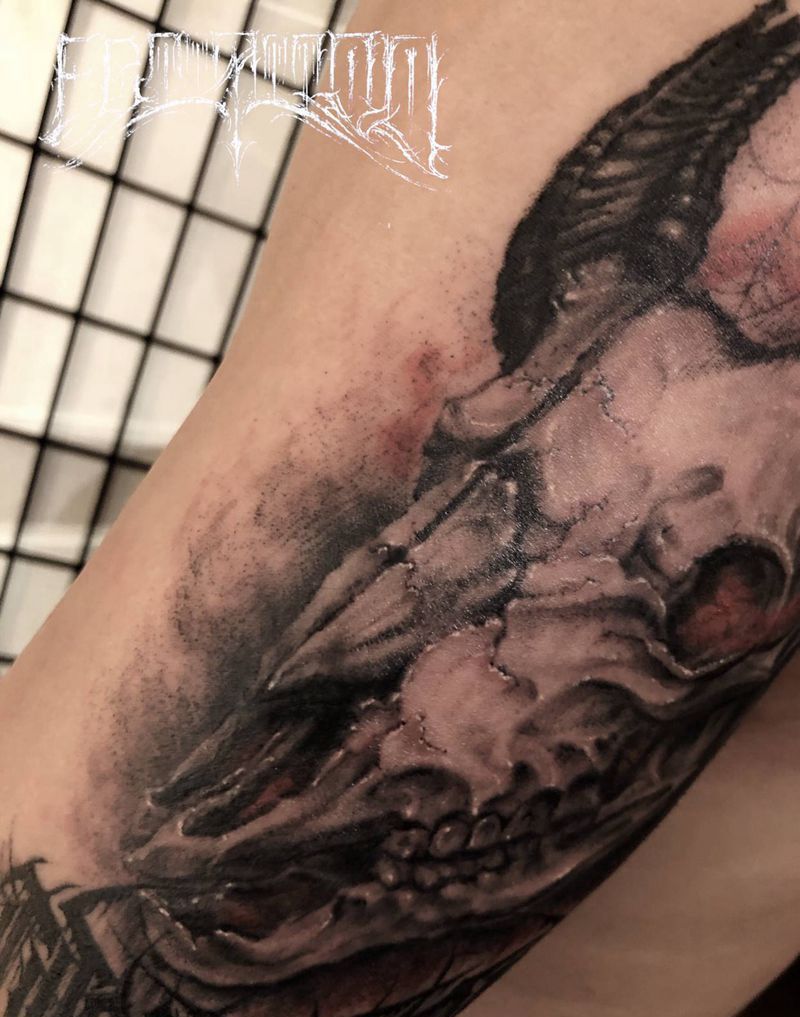 当前位置: 首页 >天津市纹身店-黑石刺青(天津店)纹身图案>hardcore纹身图片_手臂肩部欧美写实New School羊头骷髅硬核纹身图案