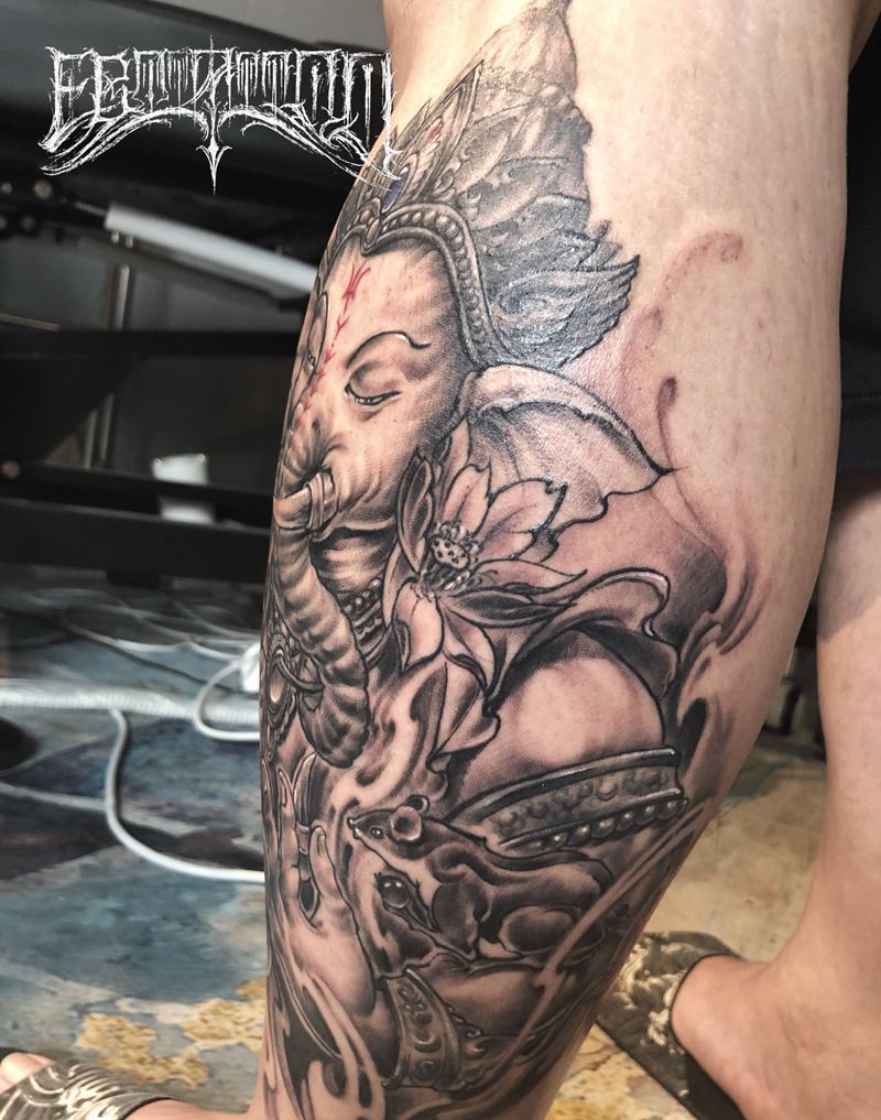 象神纹身图片_腿部新传统象神 传统纹身图案
