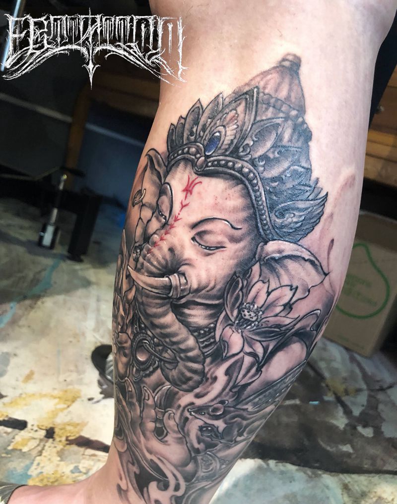 当前位置: 首页 >天津市纹身店-黑石刺青(天津店)纹身图案>象神纹身图片_腿部新传统象神 传统纹身图案