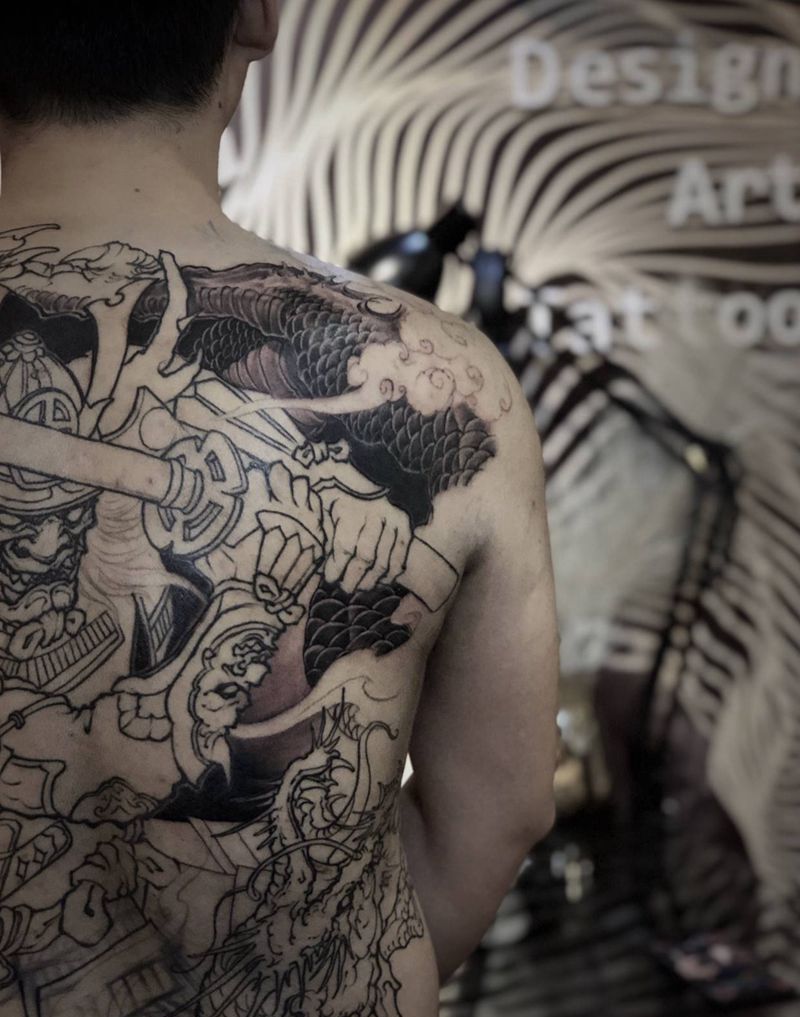 斩蛟纹身图片_背部新传统老传统鬼武士龙剑纹身图案