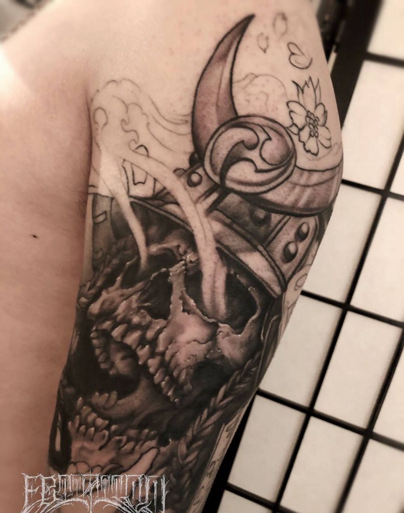 当前位置: 首页 >天津市纹身店-黑石刺青(天津店)纹身图案>暗纹身图片_手臂肩部新传统欧美写实鬼武士骷髅龙纹身图案