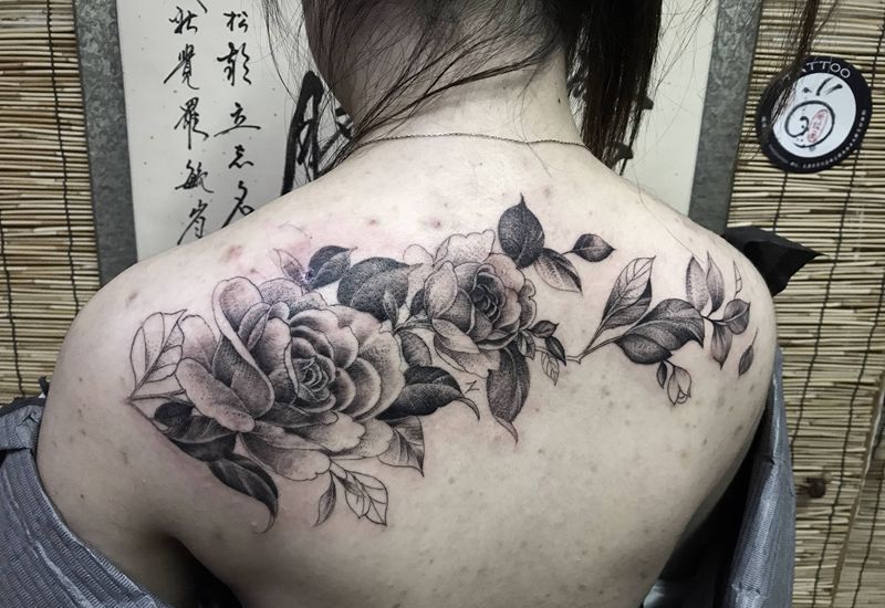 素花 点刺纹身图片_背部点刺纹身图案