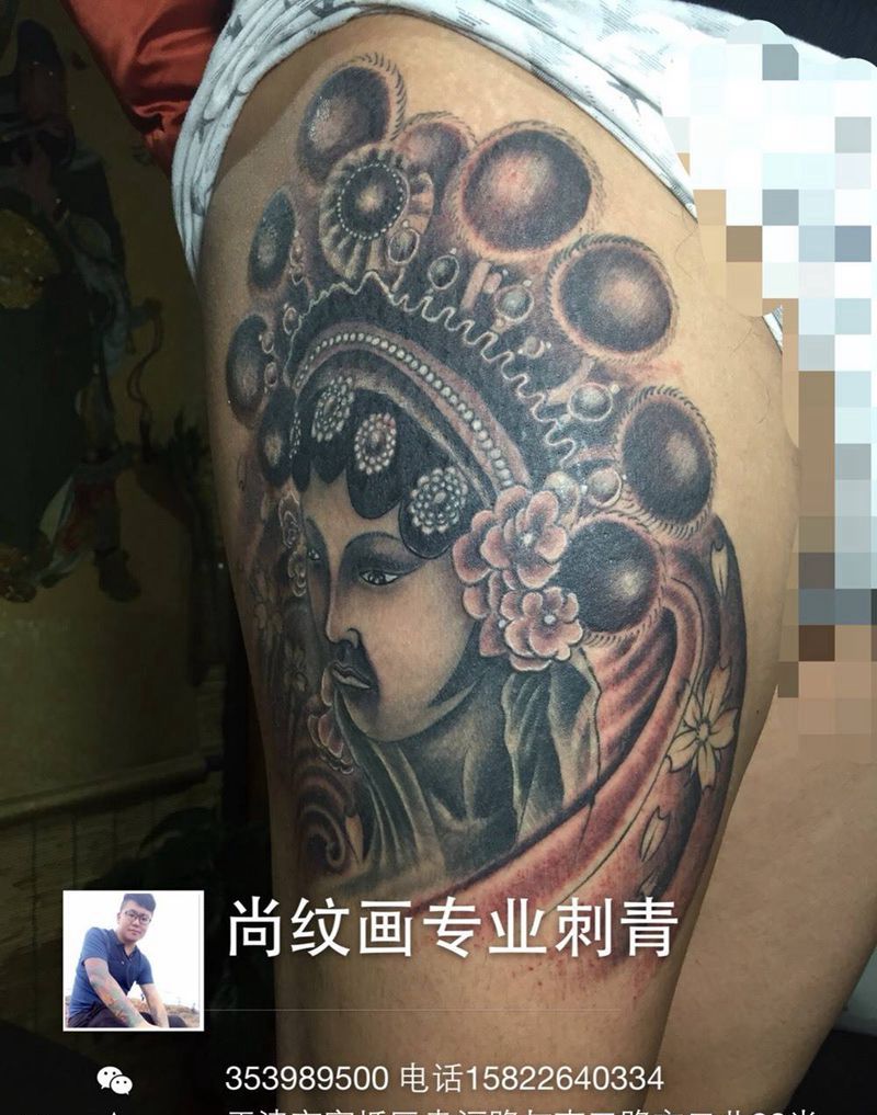 当前位置: 首页 >天津市纹身店-尚纹画专业刺青纹身图案>黑白灰花旦纹身图片_传统人物腿部纹身图案