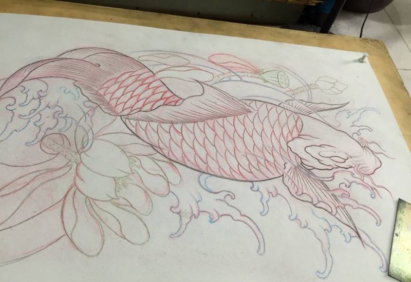 顺势而上吉祥富贵大锦鲤。纹身图片_传统手稿原创纹身图案
