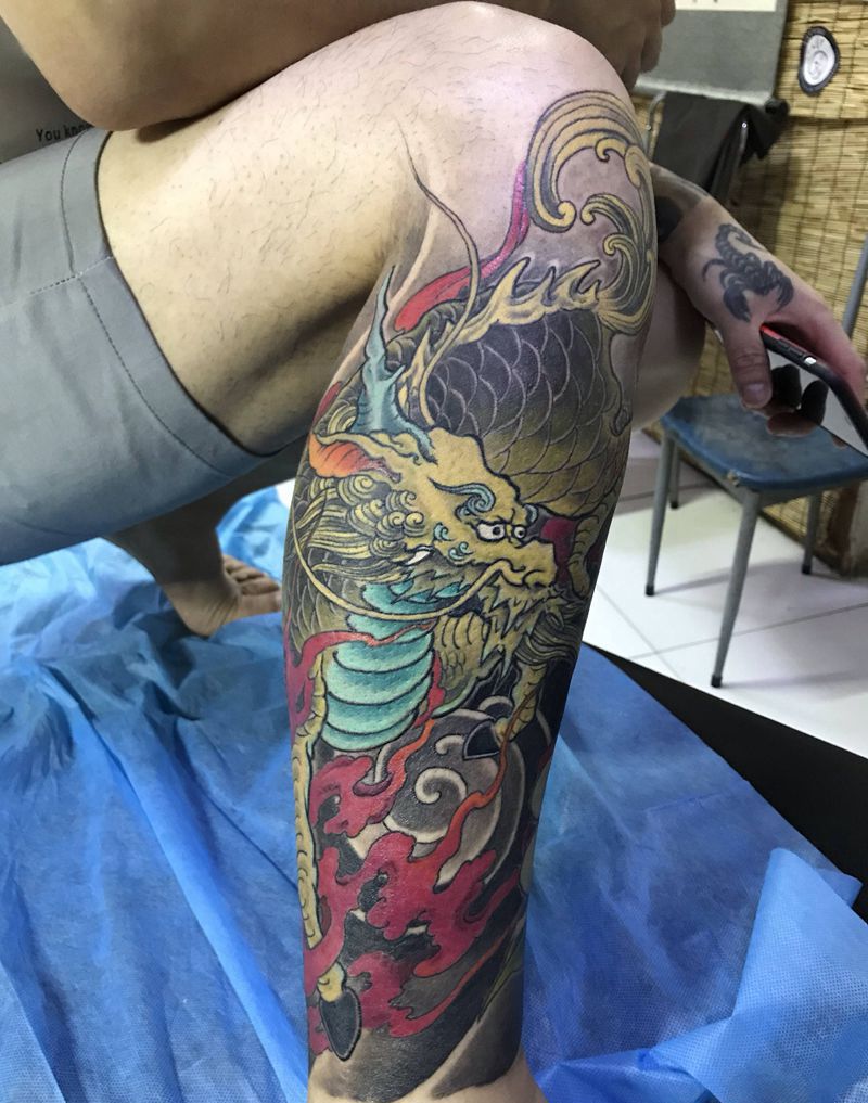 • T网红王老大花腿龙纹身图片_腿部新传统纹身图案