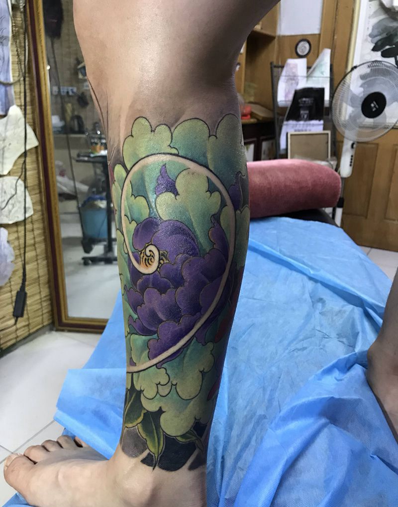 麒麟 牡丹纹身图片_腿部新传统纹身图案