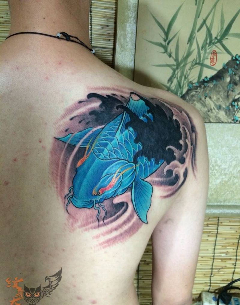 游鱼嬉水纹身图片_肩部传统动物纹身图案