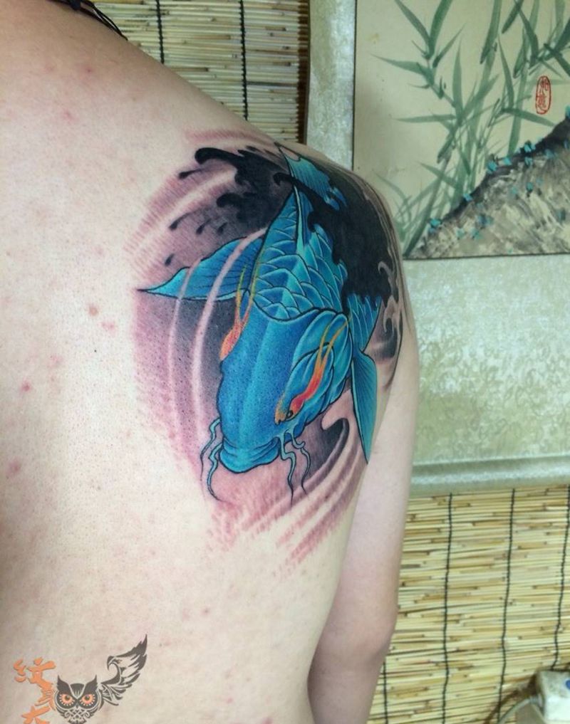 游鱼嬉水纹身图片_肩部传统动物纹身图案