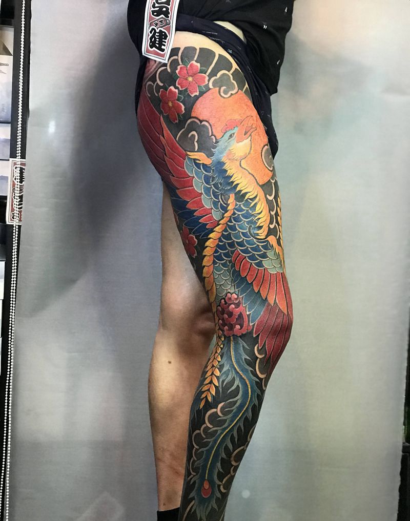 当前位置: 首页 >天津市纹身店-天津吴建刺青纹身图案>凤凰纹身图片_腿部老传统纹身图案