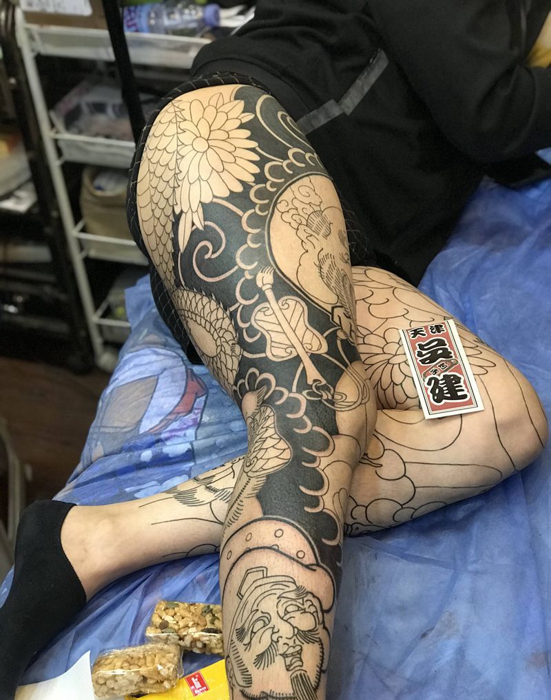 • T网红王老大花腿龙纹身图片_腿部新传统纹身图案