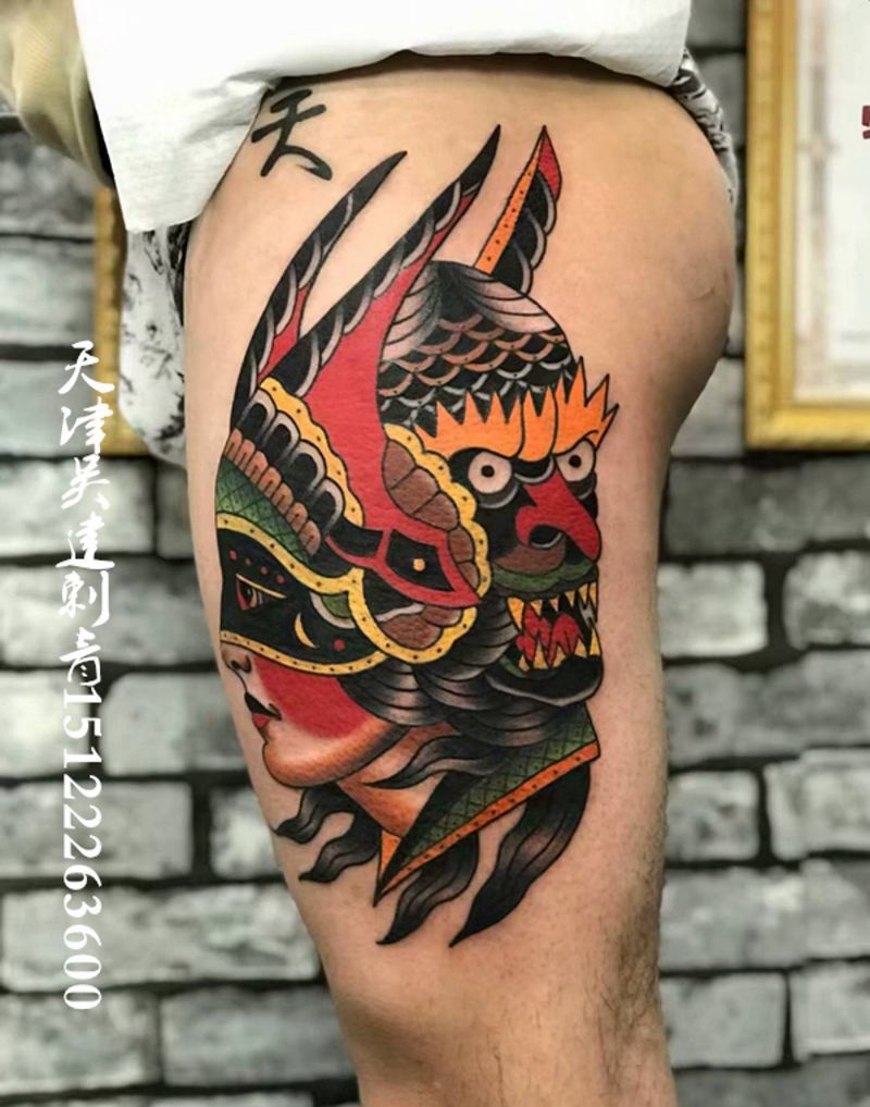 • T网红王老大花腿龙纹身图片_腿部新传统纹身图案