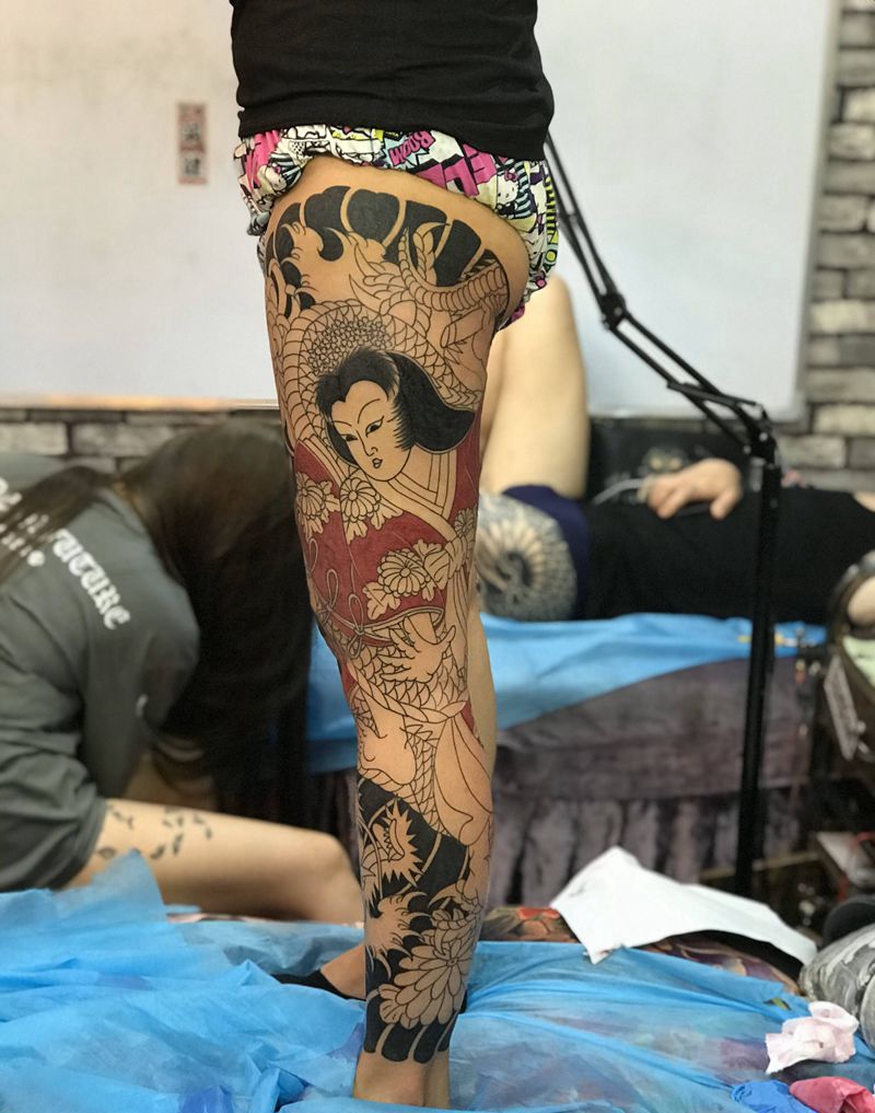 • T网红王老大花腿龙纹身图片_腿部新传统纹身图案