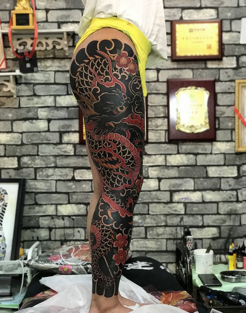 • T网红王老大花腿龙纹身图片_腿部新传统纹身图案