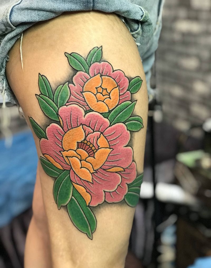 牡丹纹身图片_腿部老传统纹身图案