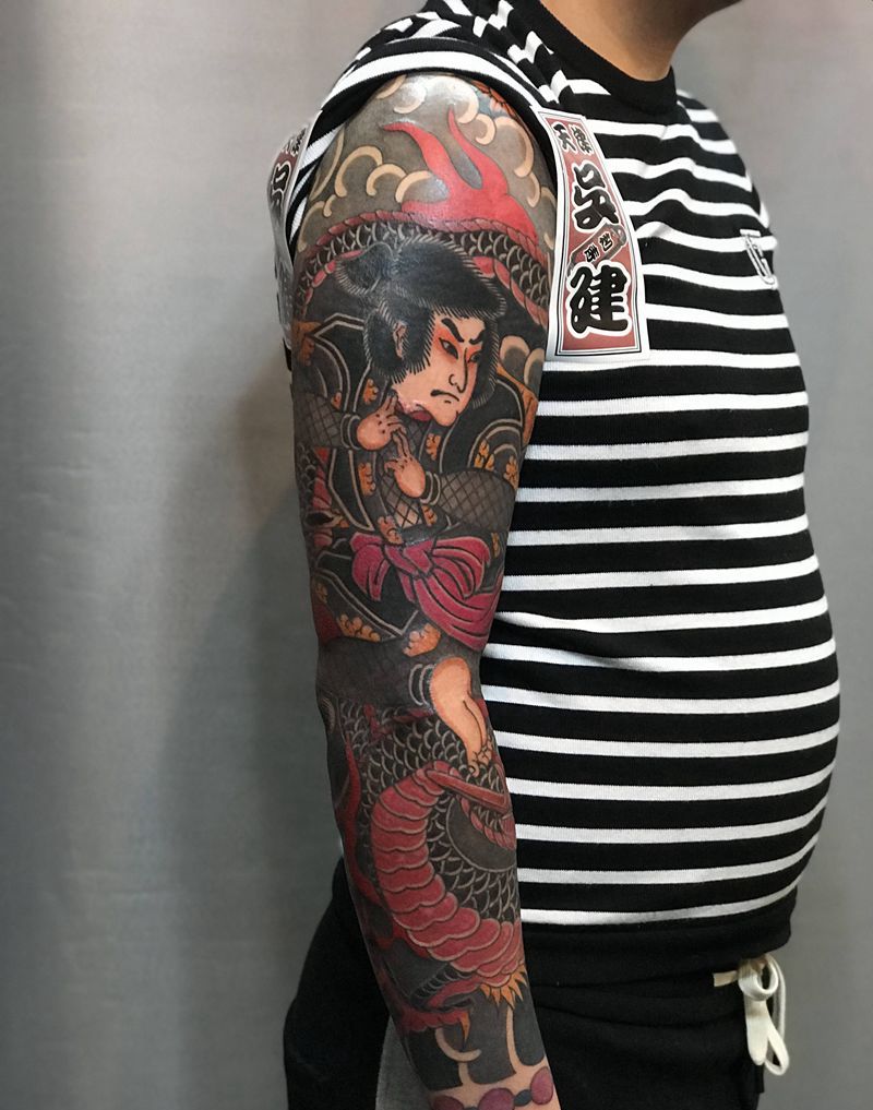 当前位置: 首页 >天津市纹身店-天津吴建刺青纹身图案>云龙九郎纹身图片_手臂老传统纹身图案
