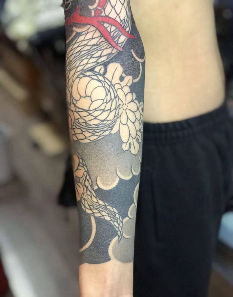 • T网红王老大花腿龙纹身图片_腿部新传统纹身图案