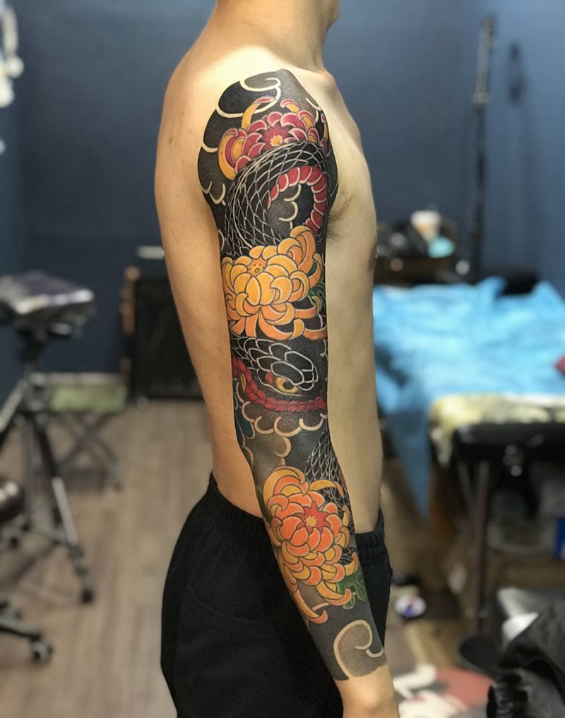 当前位置: 首页 >天津市纹身店-天津东刺青纹身图案>花臂蟒纹身图片_手臂老传统纹身图案