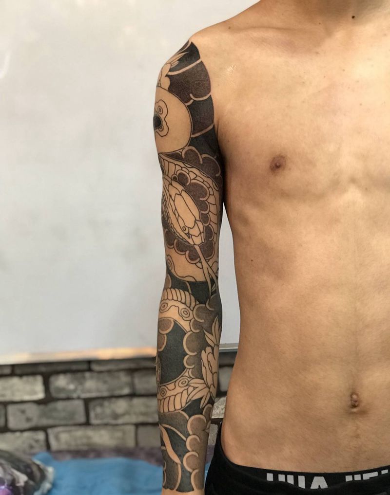 当前位置: 首页 >天津市纹身店-天津东刺青纹身图案>蟒戏牡丹花臂纹身图片_手臂老传统纹身图案