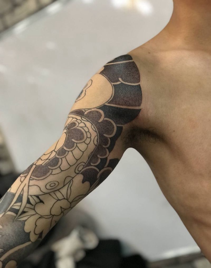 传统花臂,蟒戏牡丹纹身图片_手臂纹身图案