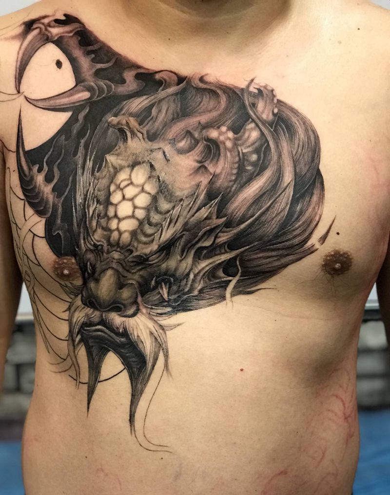 龙纹身图片_胸部新传统欧美写实纹身图案