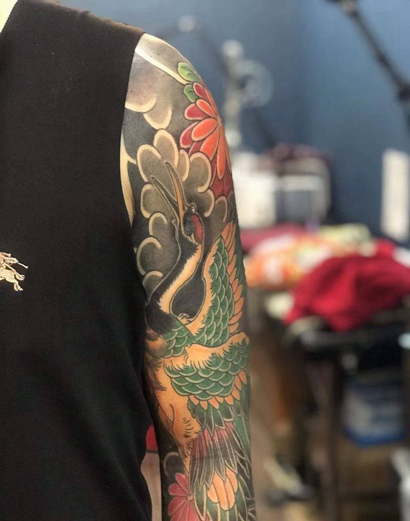 当前位置: 首页 >天津市纹身店-天津东刺青纹身图案>传统花臂鹤纹身图片_手臂老传统纹身图案
