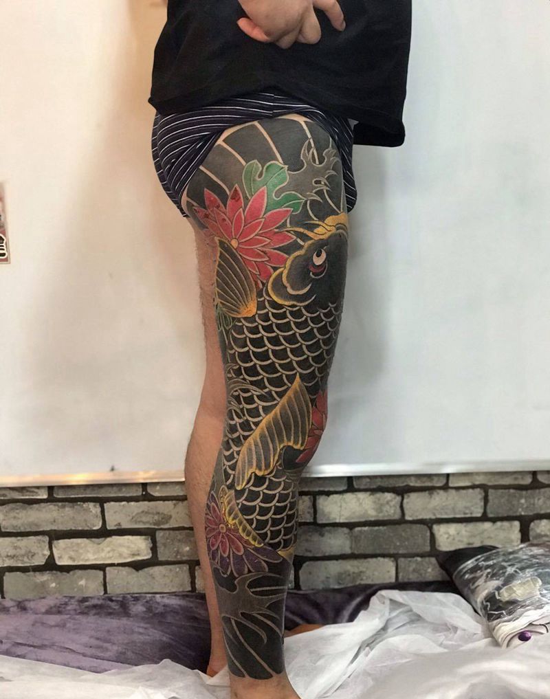 • T网红王老大花腿龙纹身图片_腿部新传统纹身图案