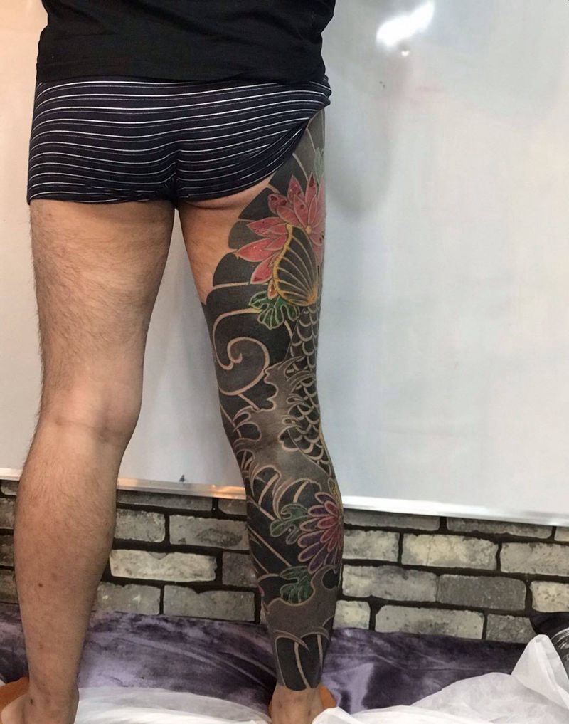 • T网红王老大花腿龙纹身图片_腿部新传统纹身图案