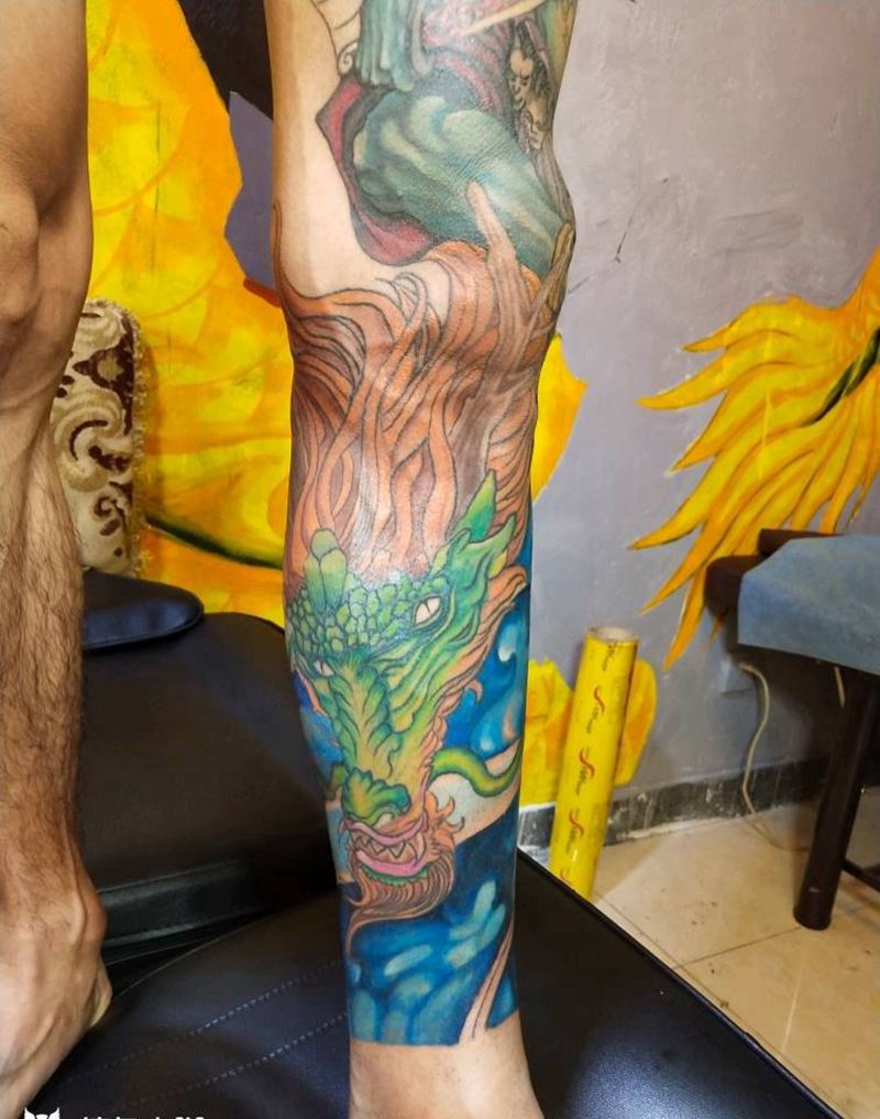 • T网红王老大花腿龙纹身图片_腿部新传统纹身图案