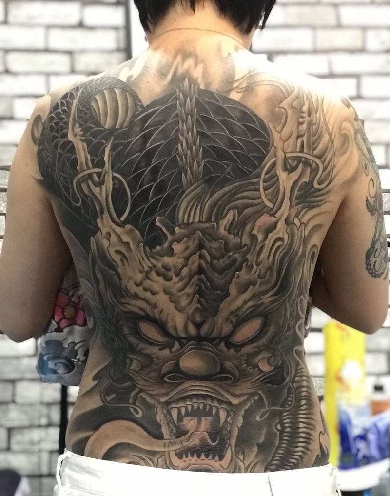 后背正脸龙纹身纹身图片_背部新传统纹身图案