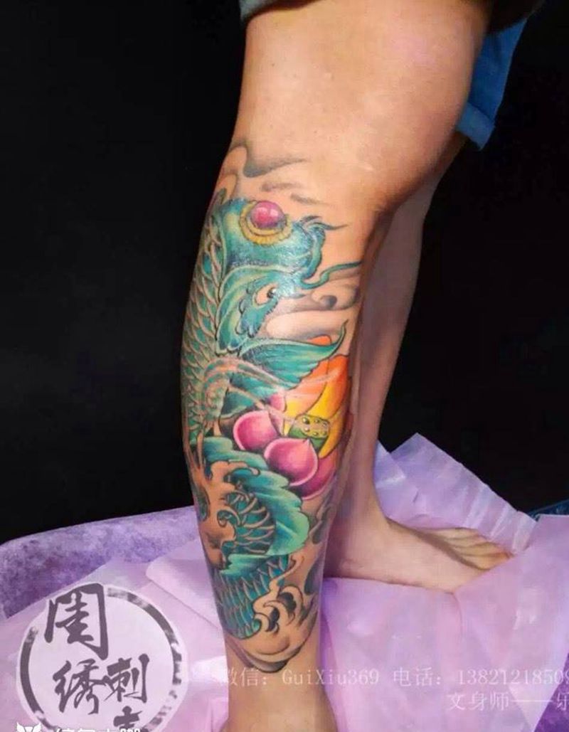 当前位置: 首页 >天津市纹身店-天津闺绣刺青纹身图案>小腿彩色锦鲤纹身图片_成品腿部传统习俗动物纹身图案