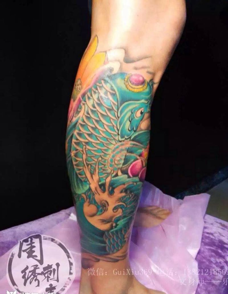 当前位置: 首页 >天津市纹身店-天津闺绣刺青纹身图案>小腿彩色锦鲤纹身图片_成品腿部传统习俗动物纹身图案