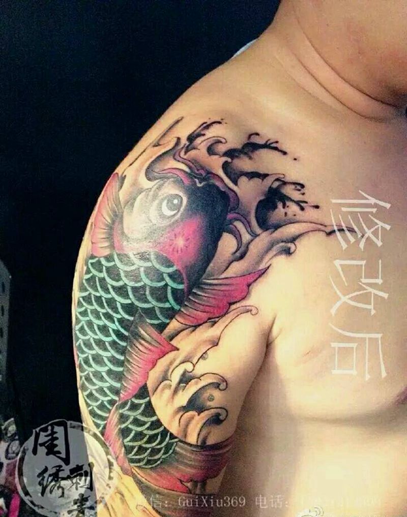 修改失败鲤鱼前后对比纹身图片_肩部手臂传统动物成品纹身图案