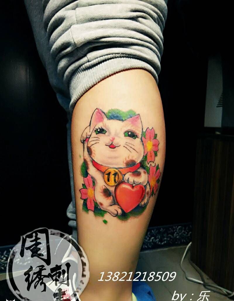 招财猫纹身图片_腿部欧美清新动物成品纹身图案