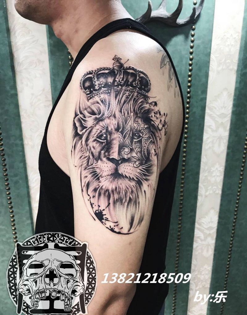 当前位置: 首页 >天津市纹身店-天津闺绣刺青纹身图案>狮子王纹身图片_成品肩部手臂欧美写实动物几何图腾纹身图案