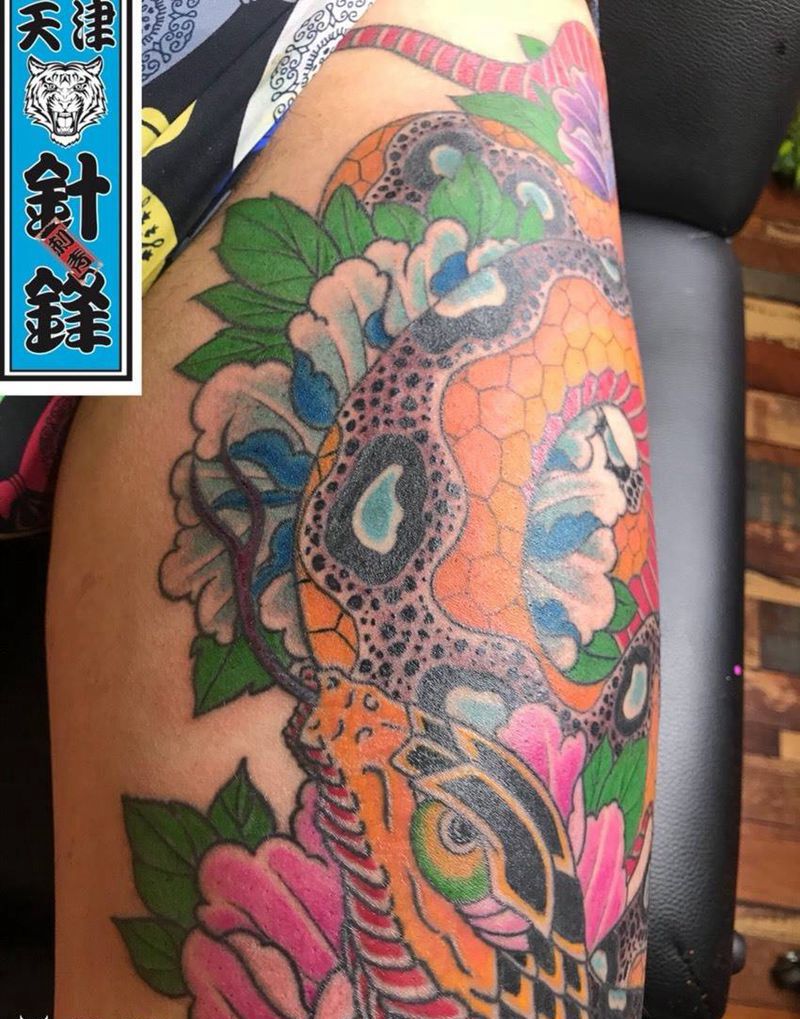 当前位置: 首页 >天津市纹身店-天津市针锋纹身工作室纹身图案>蟒戏牡丹完成纹身图片_