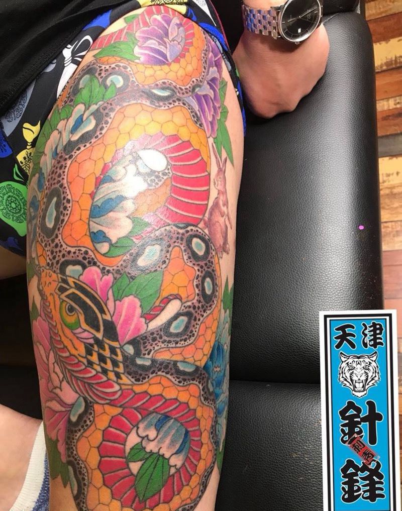 当前位置: 首页 >天津市纹身店-天津市针锋纹身工作室纹身图案>蟒戏牡丹完成纹身图片_