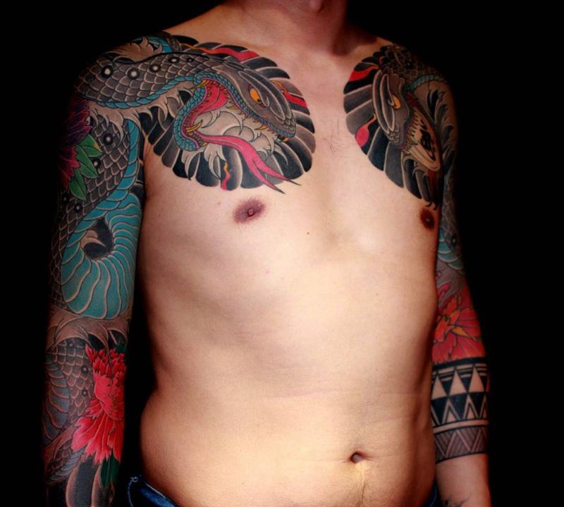 当前位置: 首页 >天津市纹身店-天津市针锋纹身工作室纹身图案>双蟒半胛纹身图片_