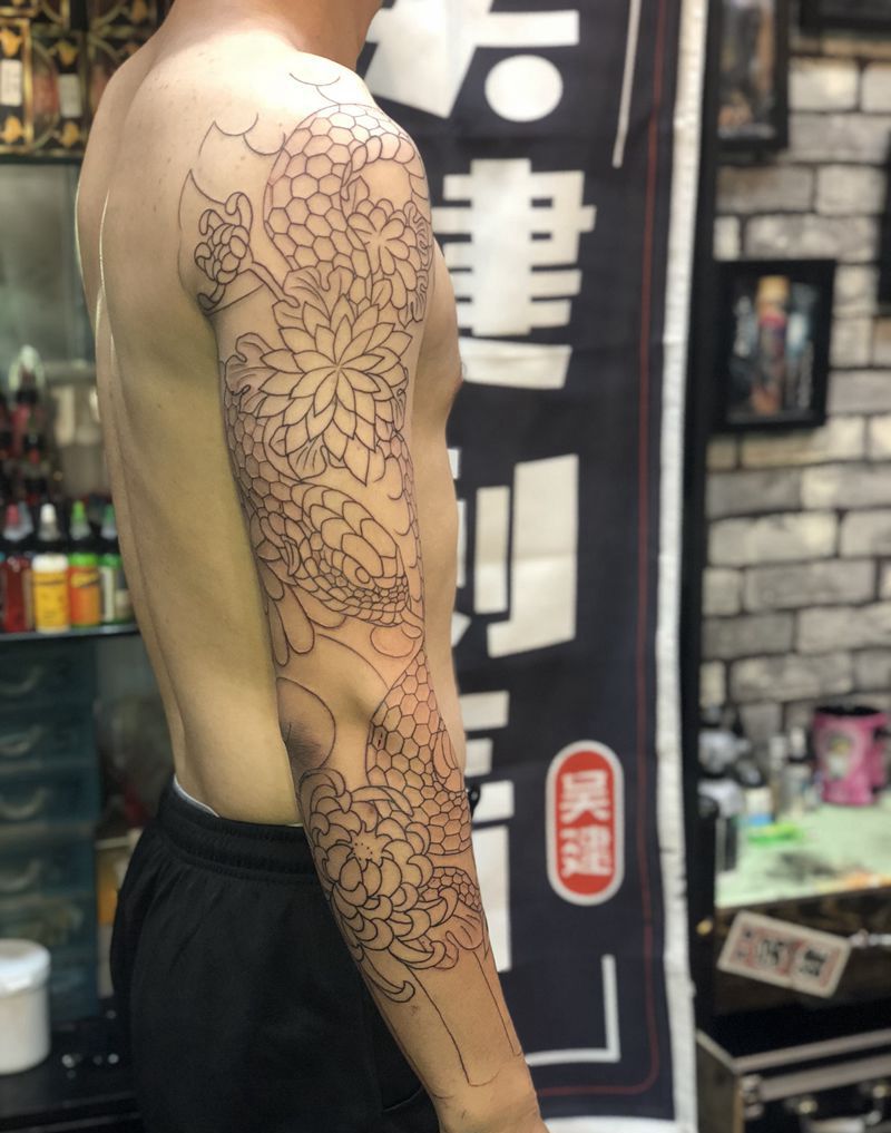 当前位置: 首页 >天津市纹身店-天津吴建刺青纹身图案>蟒戏菊花纹身图片_手臂老传统蟒纹身图案