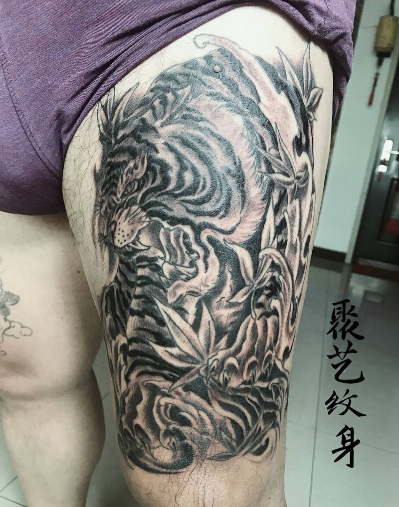 大腿老虎纹身图片_腿部纹身图案