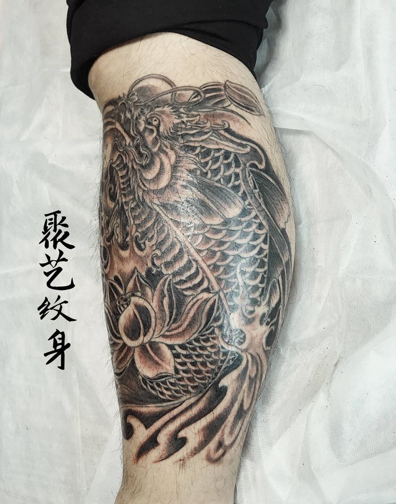 莲花鳌鱼纹身图片_腿部纹身图案