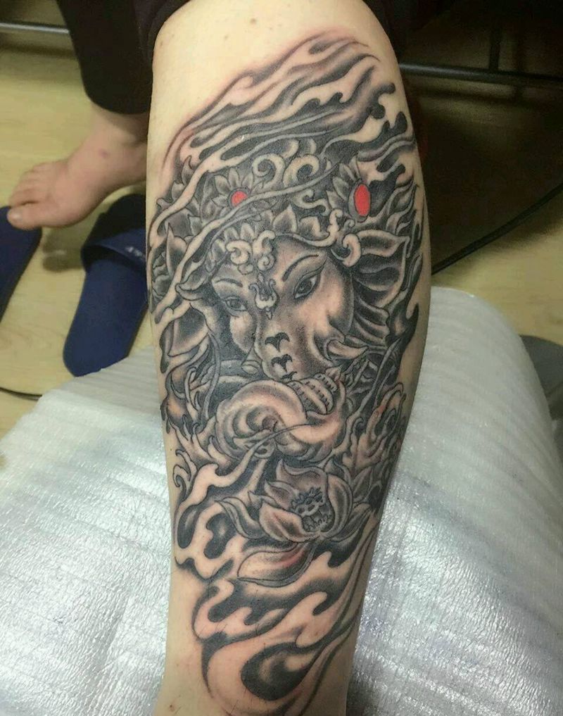当前位置: 首页 >天津市纹身店-聚艺纹身纹身图案>小腿象神纹身图片_腿部传统宗教成品纹身图案