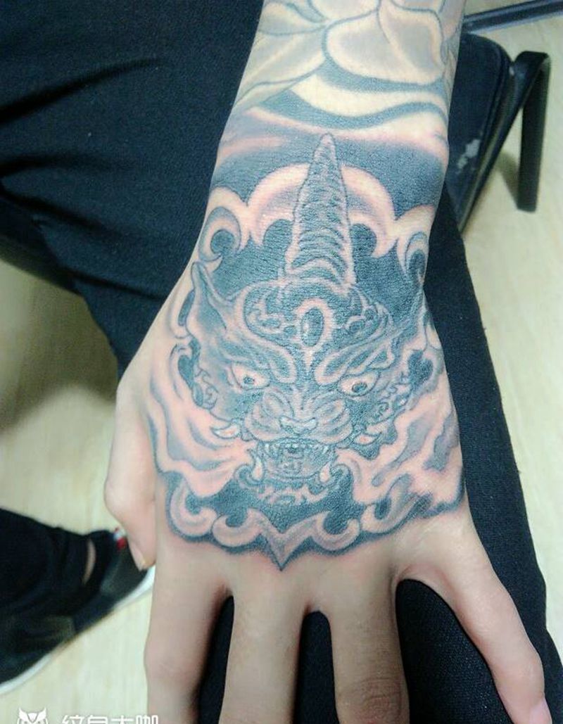 手面貔貅纹身图片_手部传统动物鬼神成品纹身图案