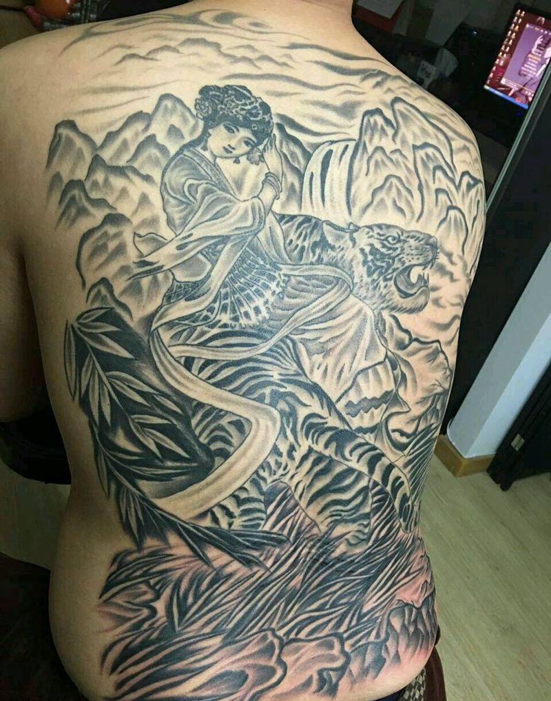 当前位置: 首页 >天津市纹身店-聚艺纹身纹身图案>跨虎游山纹身图片_背部传统动物成品纹身图案