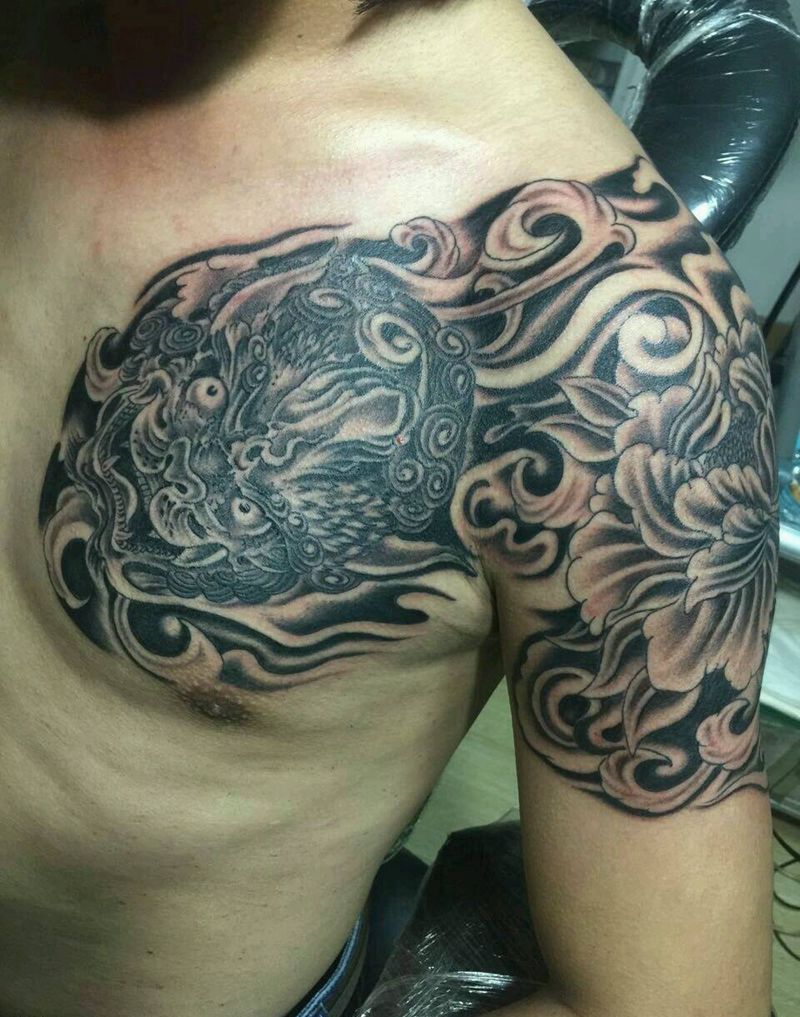 唐狮牡丹半甲纹身图片_肩部胸部手臂传统动物植物宗教成品纹身图案