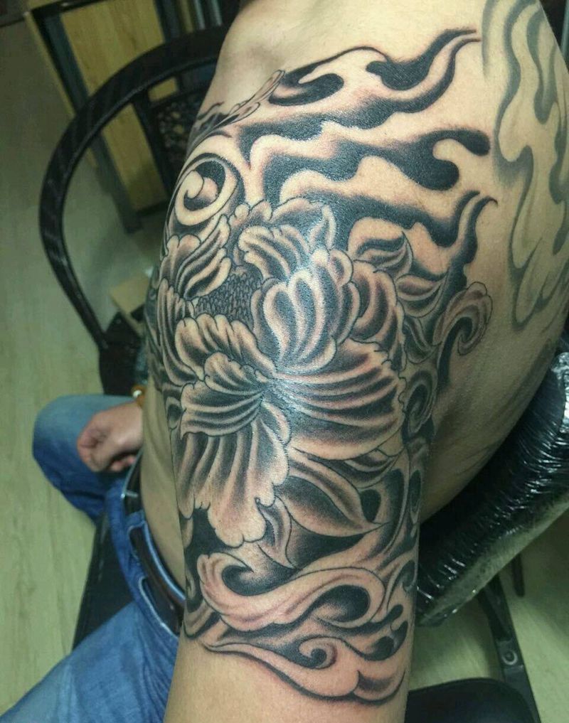 唐狮牡丹半甲纹身图片_肩部胸部手臂传统动物植物宗教成品纹身图案