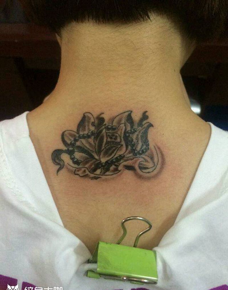 脖子莲花纹身图片_颈部传统植物宗教成品纹身图案